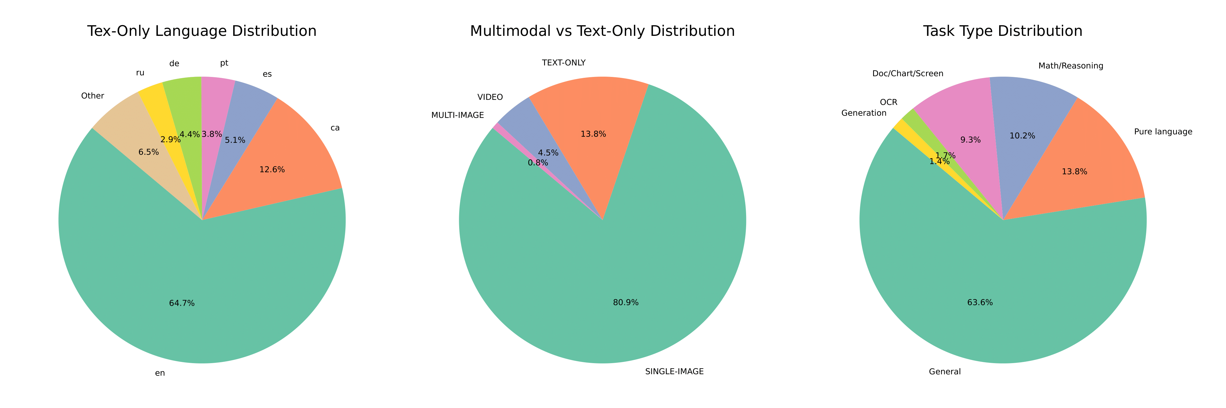 The data distribution used to finetune the model is illustrated in the figure below . Most of them were sourced from LLaVA OneVision preprocessed data. This includes data from AI2D, Cambrian, and high-quality datasets such as re-captioned detailed description data from LLaVA Next. Diverse thematic data were included to enhance the model's capabilities in subtasks such as grounding, OCR, document understanding, and math. Additionally, we incorporated text-only multilingual data in various European languages and high-quality text-only data in Spanish, Catalan, Galician, and Basque, which were also used in the instruction tuning stage.
