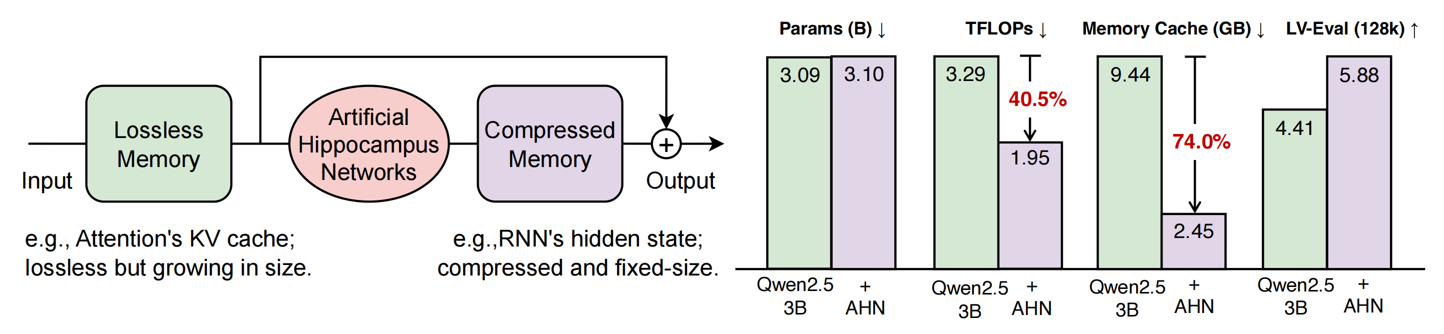 Artificial Hippocampus Networks (AHNs) transform lossless memory into fixed-size compressed representations for long-context modeling. Lossless memory (e.g., attention’s key-value (KV) cache) stores exact input information but grows with sequence length, making it inefficient for long sequences. In contrast, compressed memory (e.g., RNNs’ hidden state) maintains a constant size and offers fixed computational costs per input token, but this comes at the cost of information loss. To harness the benefits of both memory types, AHNs continually convert lossless memory outside the sliding attention window into compressed form. AHNs can be instantiated with any RNN-like architectures. The model then integrates both memory types to make predictions across long contexts.