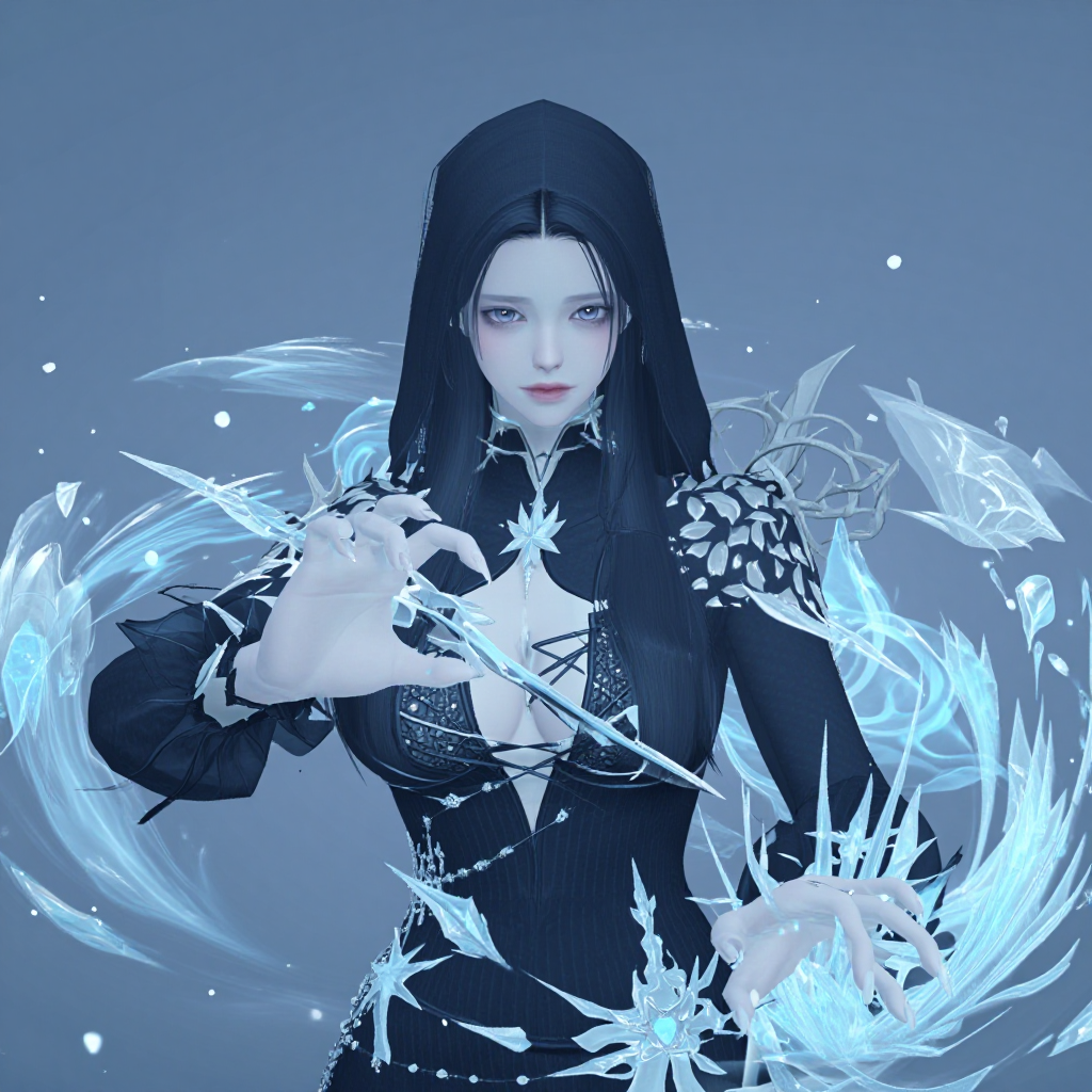 - A mysterious hooded mage casting ice magic, surrounded by blue crystalline particles