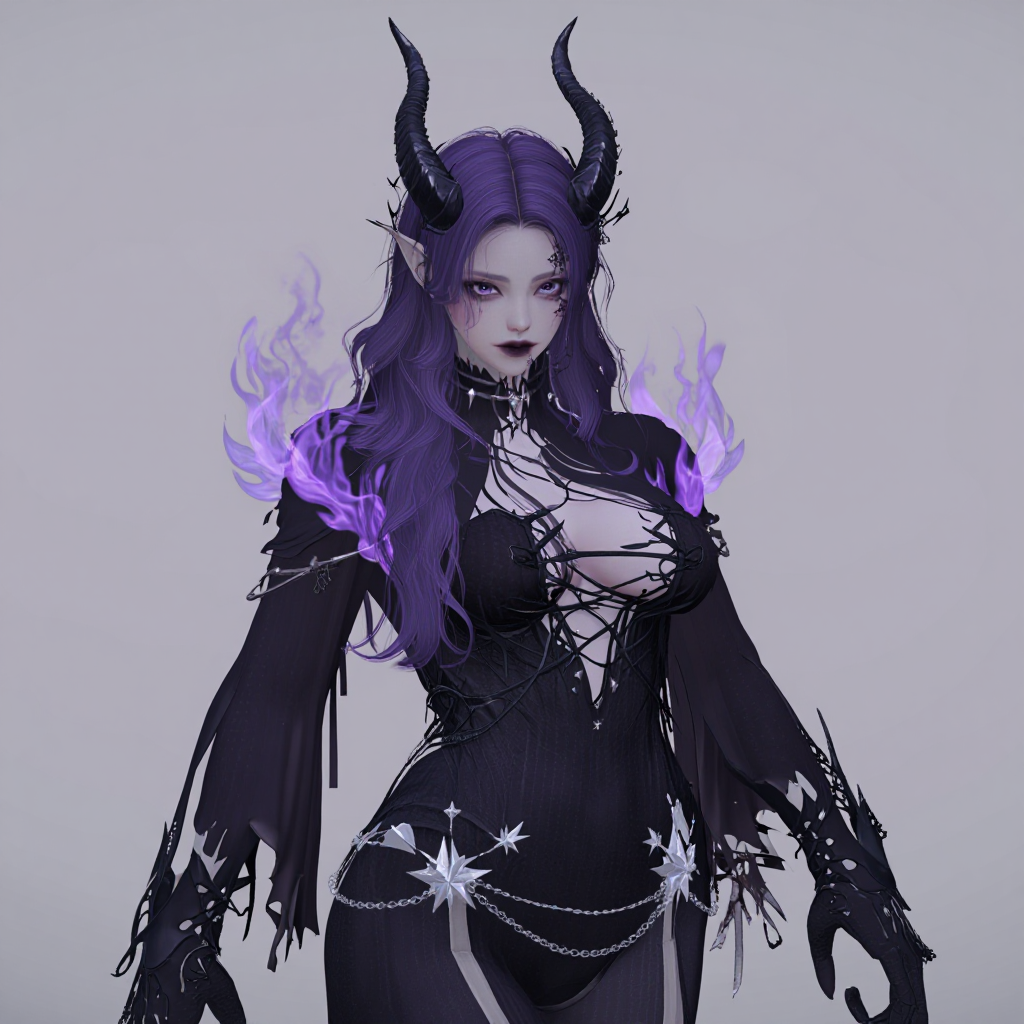 - A demonic warlock with horns and purple flames, wearing dark tattered robes