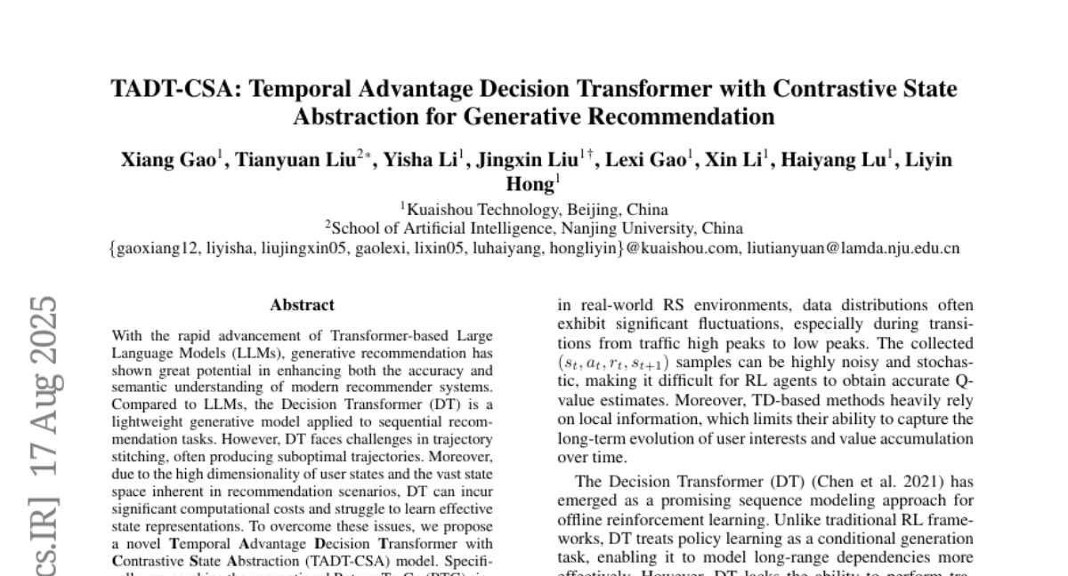TADT-CSA: Temporal Advantage Decision Transformer with Contrastive State Abstraction for Generative Recommendation