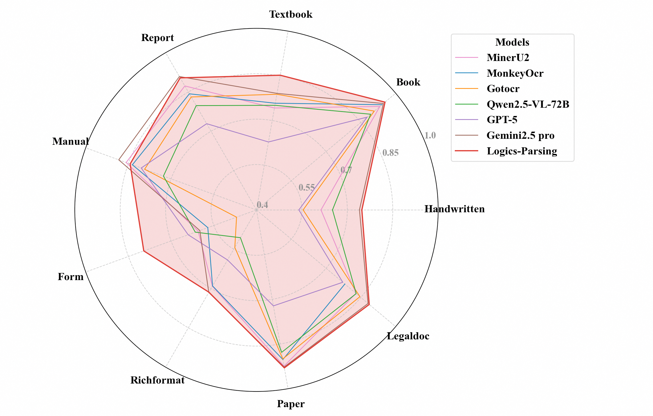 - Logics-Parsing achieves the best performance on our in-house benchmark, which is specifically designed to comprehensively evaluate a modelโs parsing capability on complex-layout documents and STEM content.