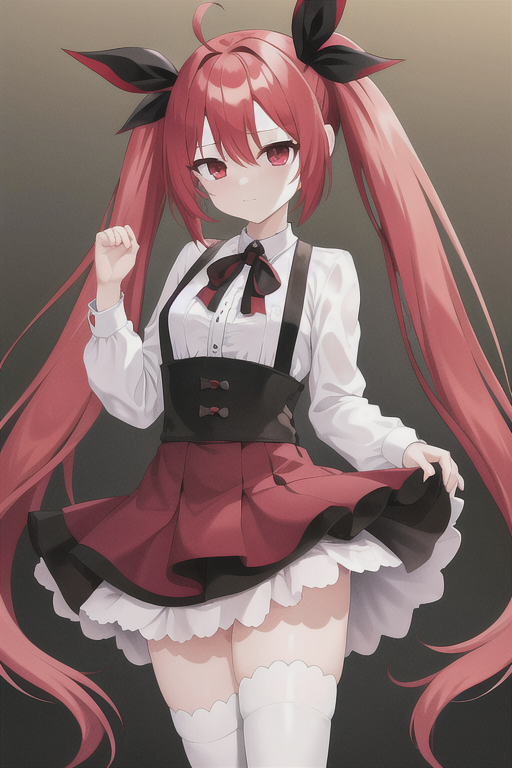 <lora:KotoriDateALiveLora:0.7>, masterpiece, highres, high quality, extremly detailed, red miniskirt, black ribbon, white shirt, black thighhighs, twintails,