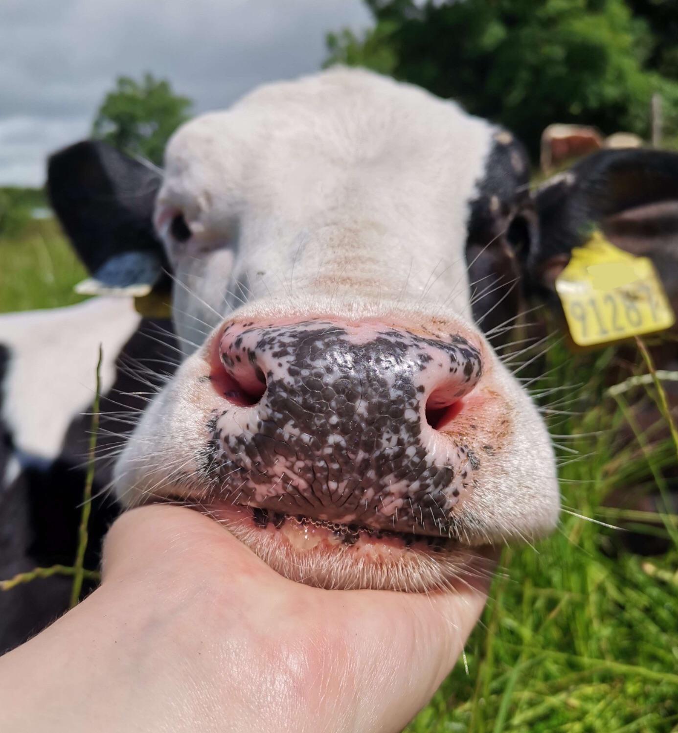 eval_img_2 A very close-up view of a cow's pink nose with black spots and white whiskers, being held from below by a fair-skinned hand. The cow's mouth is slightly open showing teeth and saliva. The cow's face is white with black patches and a yellow ear tag on its right ear with the number "9128" clearly visible on it. In the background, green grass is visible, along with parts of other black and white cows, trees, and a bright sky with some white clouds. A close up of a person's hand holding a cow's nose. A close-up shot shows a white and black spotted cow with a pink nose and mouth, positioned in the center of the frame, facing towards the right side of the image. The cow has black markings on its face and ears, and a yellow tag with the number "9126" printed on it is visible on the right ear of the cow. In the background, there are other black and white cows, some of which are partially visible behind the cow on the left, and green grass is visible in the foreground. The sky is overcast and grey. A hand with visible skin is in the lower foreground, holding the cow's mouth.
