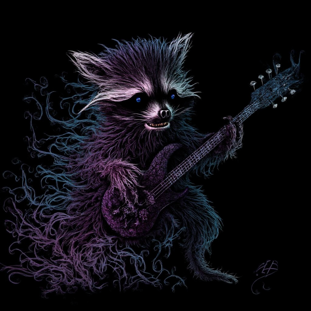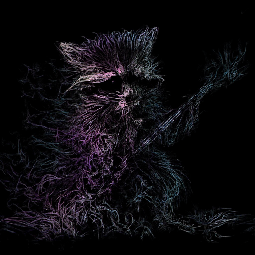 - a flame fractal in the shape of a raccoon playing the electric guitar, PLE style