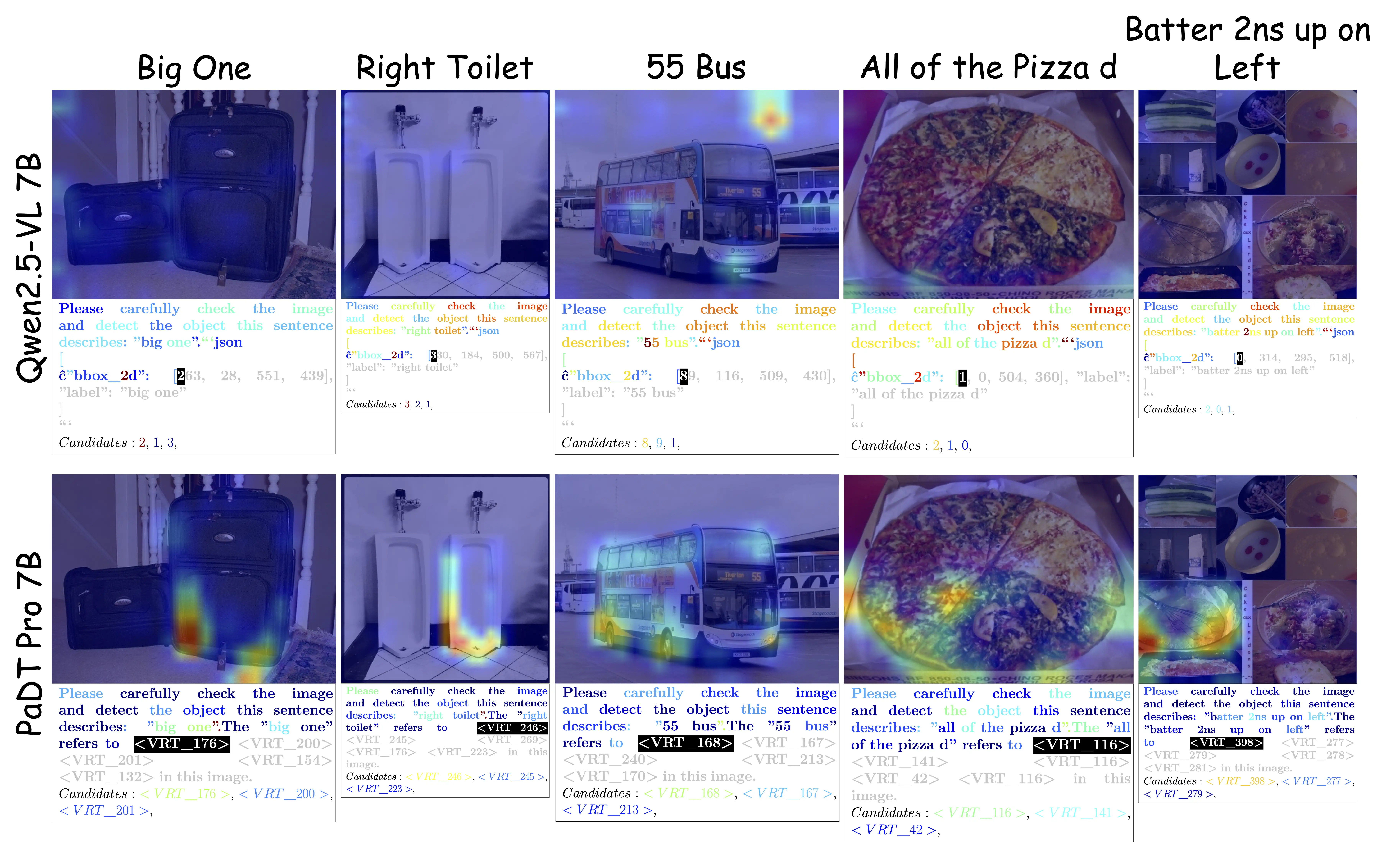 At the core of PaDT are Visual Reference Tokens (VRTs). Unlike conventional MLLMs that represent visual targets using text-based bounding box coordinates (which are often less semantic and poorly aligned with the actual objects, as shown in Figure B), PaDT allows MLLMs to represent visual targets directly through visual patches. These VRTs let the model reason about visual information within the output sequence in a more natural and direct way.