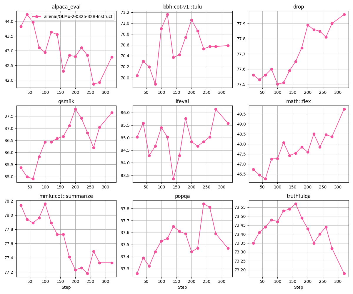 Below are the other eval scores over steps for allenai/OLMo-2-0325-32B-Instruct: