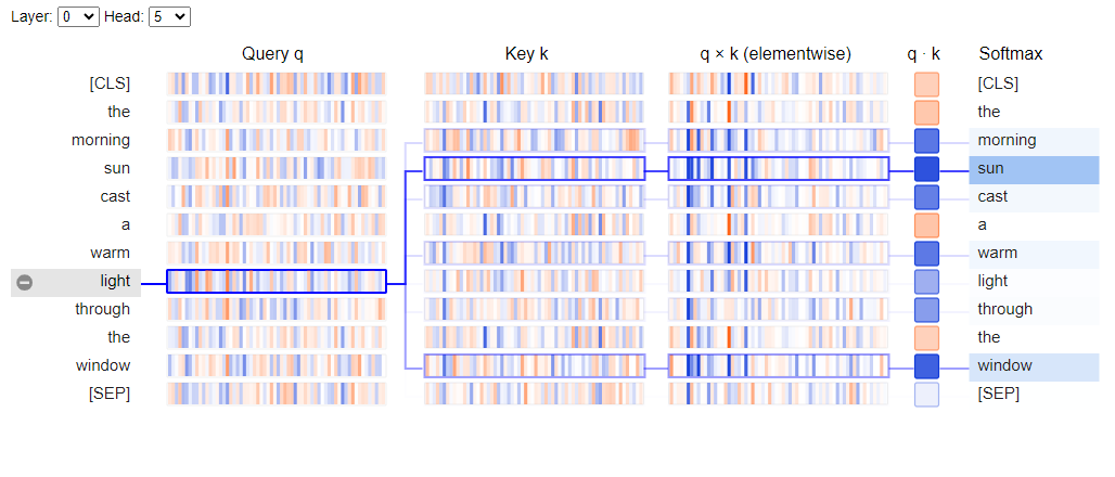 In the next figures we can see that while self-attention enables the model to correctly learn contextual dependencies and semantic understanding across each input sequence, the computational complexity is indeed quadratic. For each attention head in a single layer, attention requires to perform Query (Q) and Key (K) matrix multiplications, creating an attention matrix where each entry represents the attention score between a pair of tokens in the sequence (dark blue boxes indicate higher attention scores):