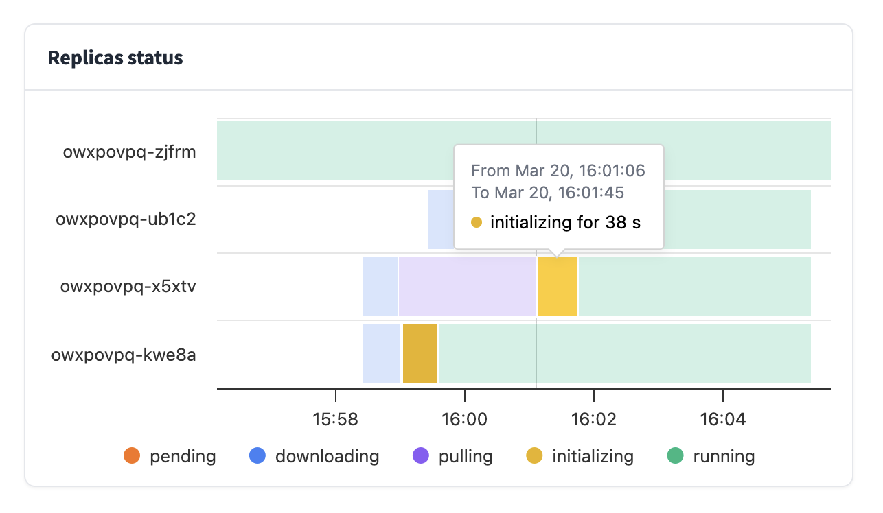 🔄 Replica Lifecycle View: Understanding what’s happening with your replicas is crucial, so we’ve introduced a detailed view of each replica’s lifecycle. You can now track replicas from initialization to termination, observing every state transition in between. This helps understand what's going on with your endpoint even if you have several moving parts.