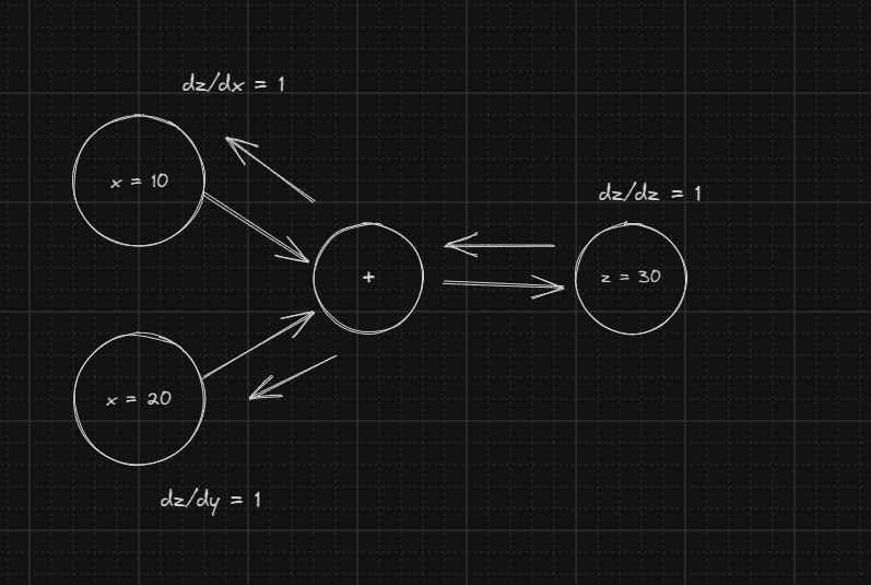 since z has grident 1, x and y got both grident 1 this will be usefull in residual connections in transformers