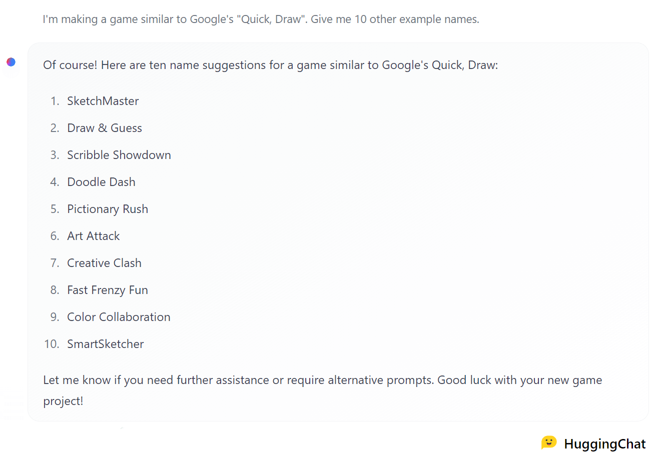 In the spirit of open-source development, I decided to ask Hugging Chat for some game name ideas... and needless to say, it did not disappoint!
