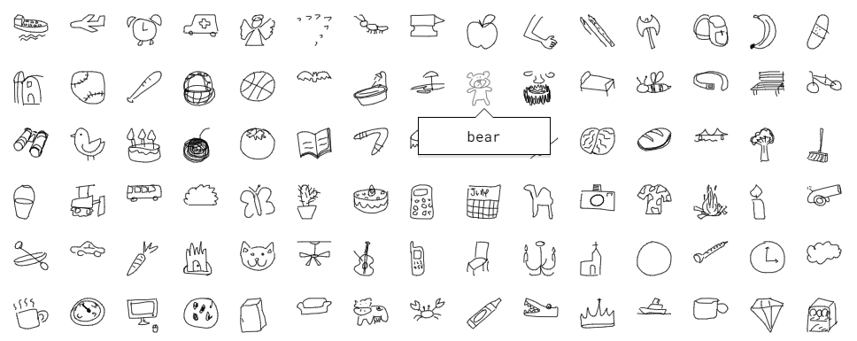 We'll be training our model using a subset of Google's Quick, Draw! dataset, which contains over 5 million drawings across 345 categories. Here are some samples from the dataset: