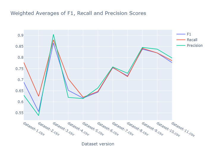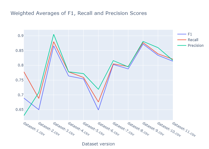 The weighted average of F1, Recall, and Precision scores for 40 runs.