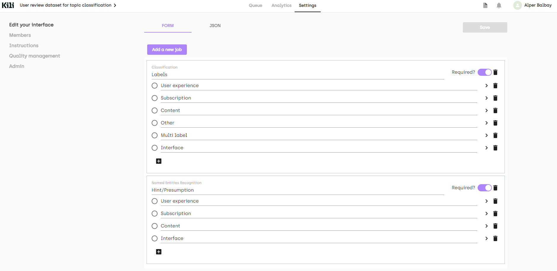 In our example, we added two more labels (Other, Multi-label). We also added a named entity recognition (NER) job just to specify how we decided on a label while labeling. The final interface is shown below