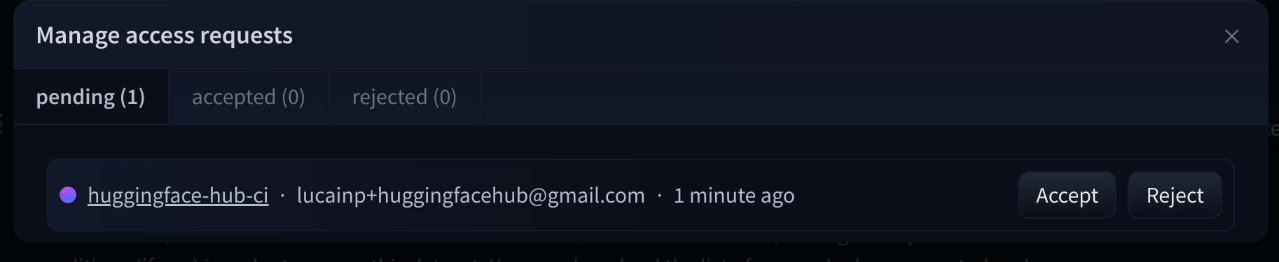 - rejected: the list of users you’ve manually rejected. Those users cannot access your datasets. If they go to your dataset repository, they will see a message Your request to access this repo has been rejected by the repo’s authors.