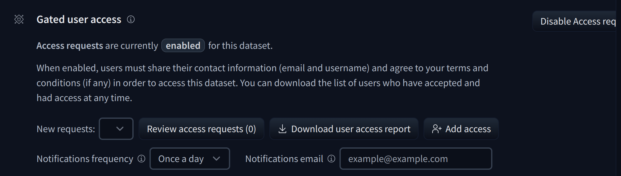 To enable access requests, go to the dataset settings page. By default, the dataset is not gated. Click on Enable Access request in the top-right corner.