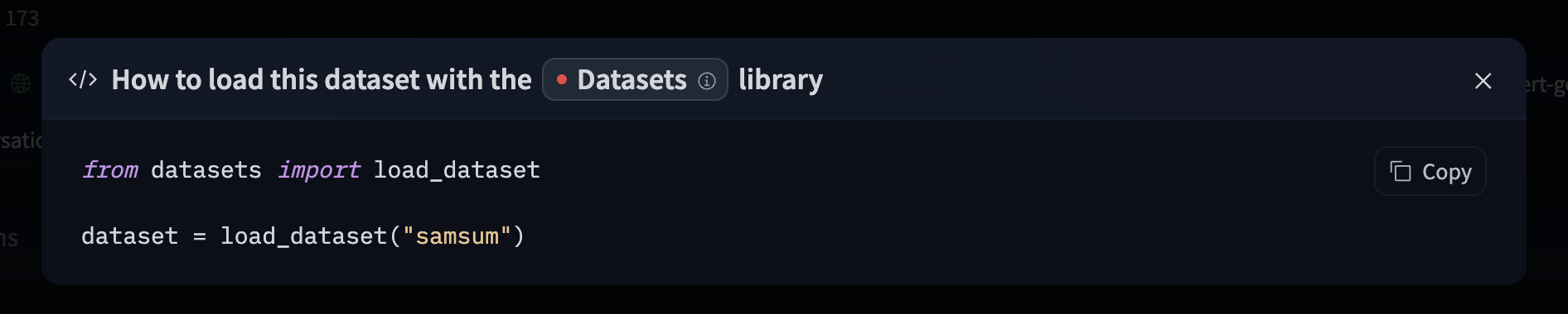 If a dataset on the Hub is tied to a supported library, loading the dataset can be done in just a few lines. For information on accessing the dataset, you can click on the “Use this dataset” button on the dataset page to see how to do so. For example, samsum shows how to do so with datasets below.