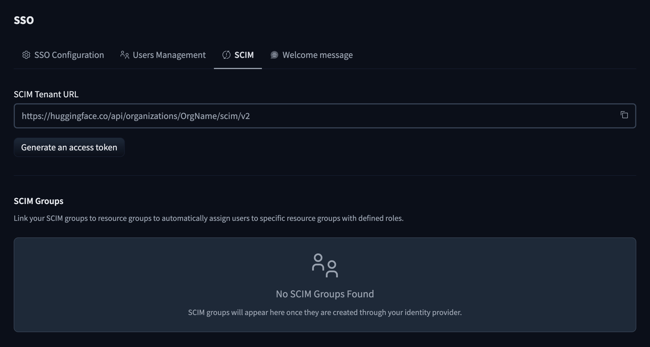 SCIM, or System for Cross-domain Identity Management, is a standard for automating user provisioning. It allows you to connect your Identity Provider (IdP) to Hugging Face to automatically manage your organization’s members.