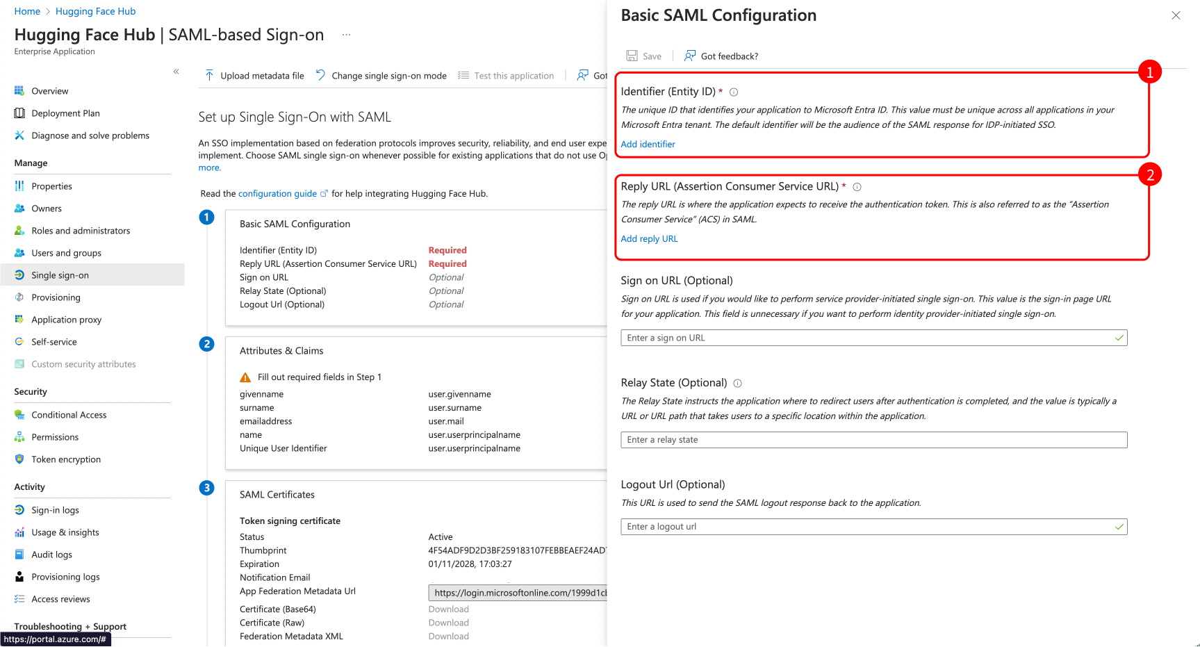 Copy the “SP Entity Id” from the organization’s settings on Hugging Face, and paste it in the “Identifier (Entity Id)” field on Azure (1).