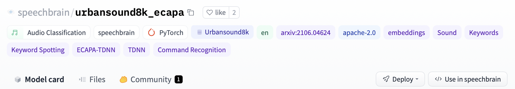 out_prob, score, index, text_lab = classifier.classify_file('speechbrain/urbansound8k_ecapa/dog_bark.wav')If you want to see how to load a specific model, you can click Use in speechbrain and you will be given a working snippet that you can load it!