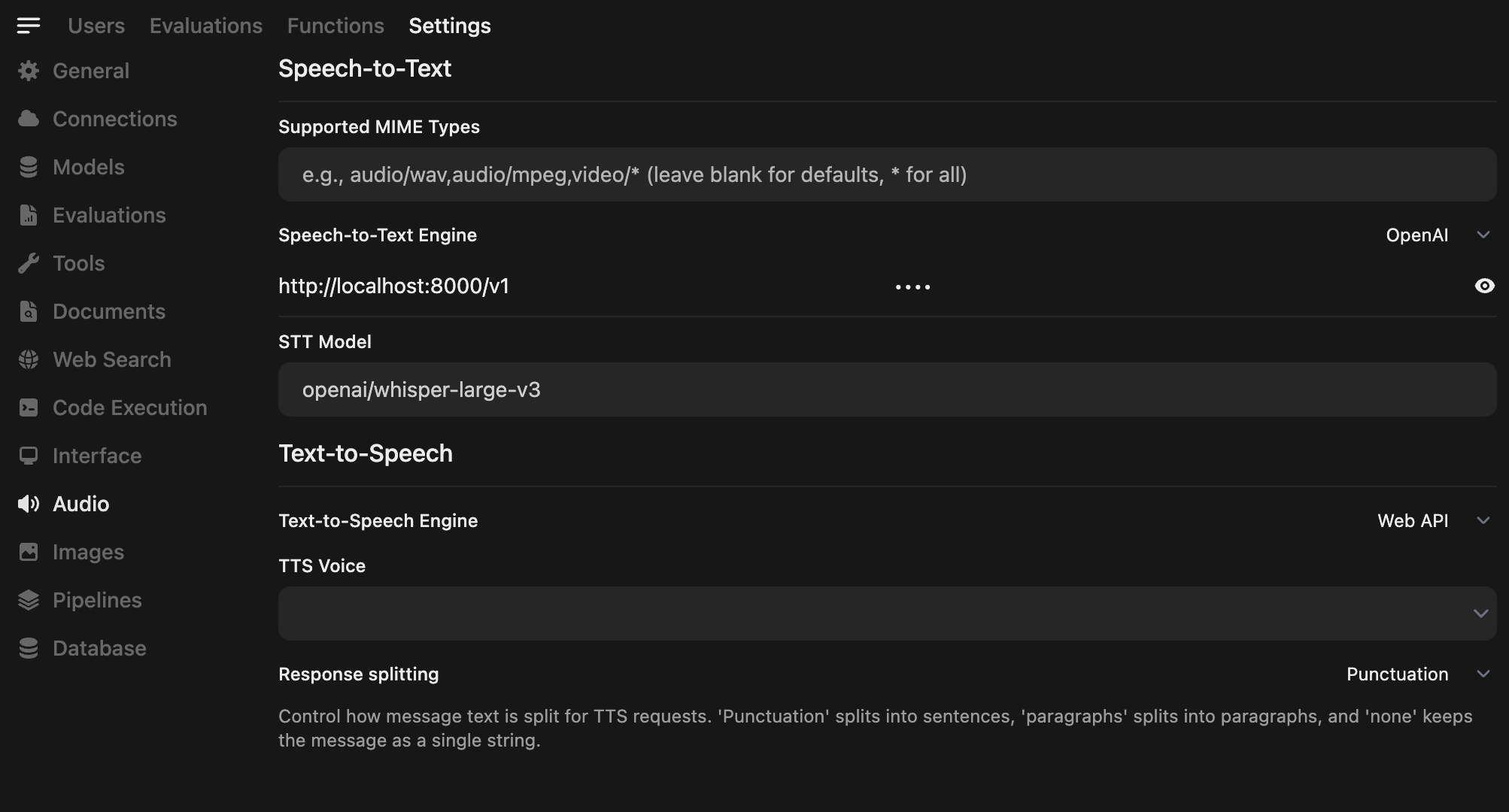 Before you can speak into Open WebUI, you need to update its settings to use your server for speech to text (STT) tasks. Launch Open WebUI, and navigate to the audio tab inside the admin settings. If you’re using Open WebUI with the default ports, this link (default) or this link (python deployment) will take you there. Do the following changes there: