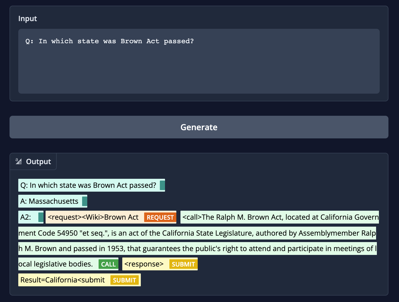 • ToolFormer’s wiki tool returns “The Ralph M. Brown Act is an act of the California State Legislature that guarantees the public’s right to attend and participate in meetings of local legislative bodies.” which is more succinct.