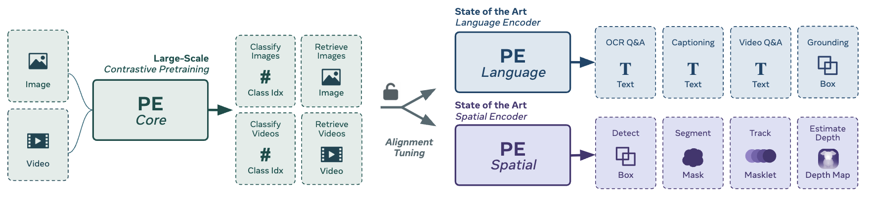 Model Overview: Perception Encoder (PE) is a family of large-scale vision encoder models with state-of-the-art performance on a large variety of vision tasks. By using a robust contrastive pretraining recipe and finetuning on synthetically aligned videos, PE not only outperforms all existing models on classification and retrieval, but it also internally produces strong, general features that scale for downstream tasks. PE unlocks the ability for large-scale contrastive pretraining to transfer to downstream tasks with alignment tuning to capitalize on those general features.