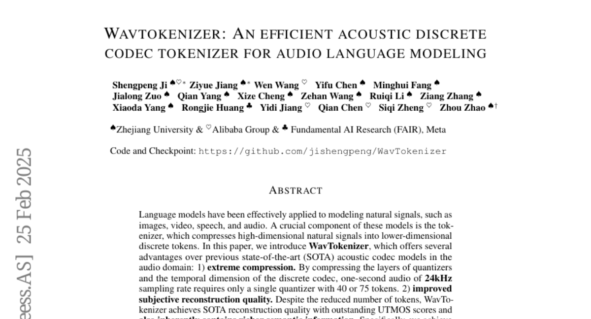 WavTokenizer-Medium-Large https://arxiv.org/abs/2408.16532 novateur/WavTokenizer-medium-speech-75token Updated Sep 19, 2024 • 2 novateur/WavTokenizer-medium-music-audio-75token Updated Sep 19, 2024 • 6 novateur/WavTokenizer-large-unify-40token Updated Oct 22, 2024 • 6 novateur/WavTokenizer-large-speech-75token Updated Mar 10 • 14
