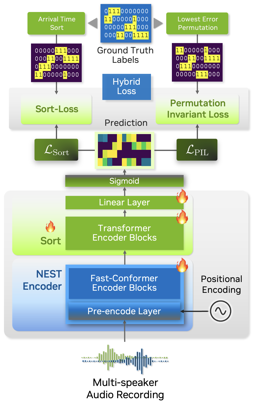 Sortformer consists of an L-size (18 layers) NeMo Encoder for Speech Tasks (NEST)[2] which is based on Fast-Conformer[3] encoder. Following that, an 18-layer Transformer[4] encoder with hidden size of 192, and two feedforward layers with 4 sigmoid outputs for each frame input at the top layer. More information can be found in the Sortformer paper[1].