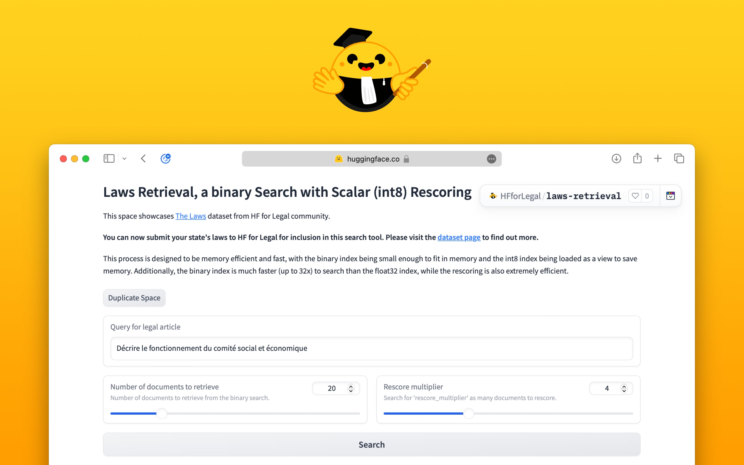 Introducing the first two projects on the HFforLegal community: the 'Laws' dataset and the associated search tool based on @nreimers and @tomaarsen 's Sentence Transformers library 🤗