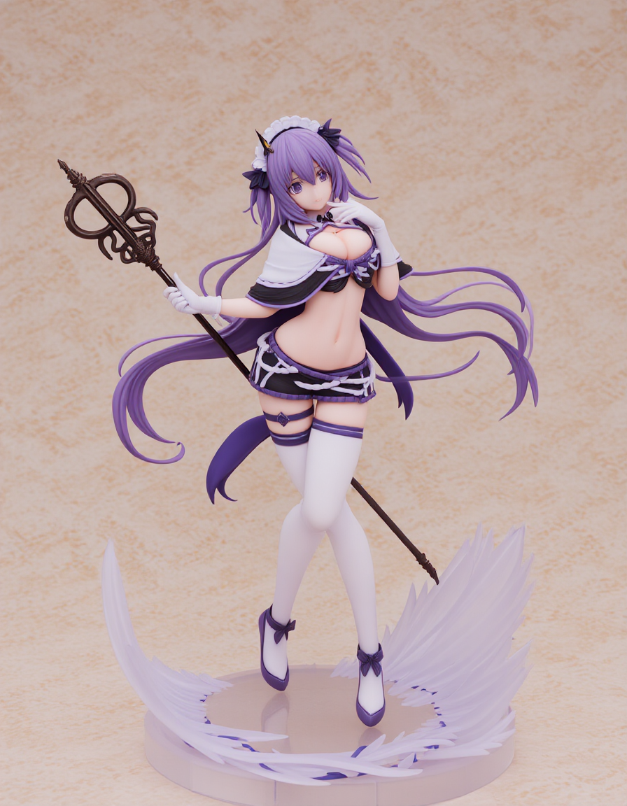 - 1girl, solo, full body, gloves, groin, hair between eyes, hair ornament, head tilt, holding, holding staff, horns, long hair, looking at viewer, maid headdress, mole, mole under eye, navel, parted lips, purple eyes, purple hair, purple theme, shawl, shorts, single horn, staff, standing, thighhighs, twintails, white footwear, white gloves, white thighhighs