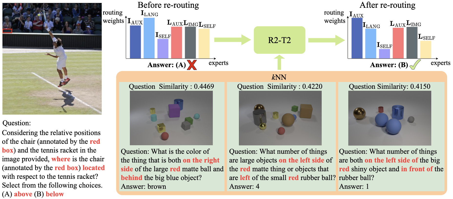 A test-time re-routing method improves the performance of multimodal models by optimizing routing weights for non-language modalities, enhancing accuracy in challenging tasks without training.