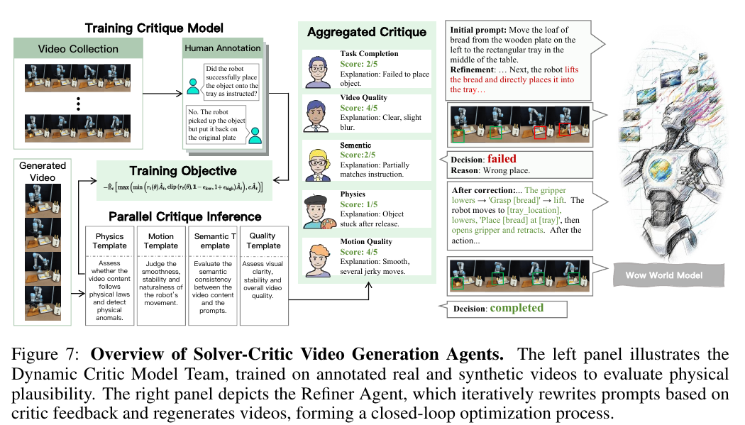 • A Cognitive Loop for Self-Correction: WoW engages in cognitive self-reflection through our SOPHIA framework. It first imagines a future by generating a video. An integrated VLM-based critic then evaluates whether this imagined future is physically plausible, allowing the model to reflect and refine its own understanding in a closed loop.
