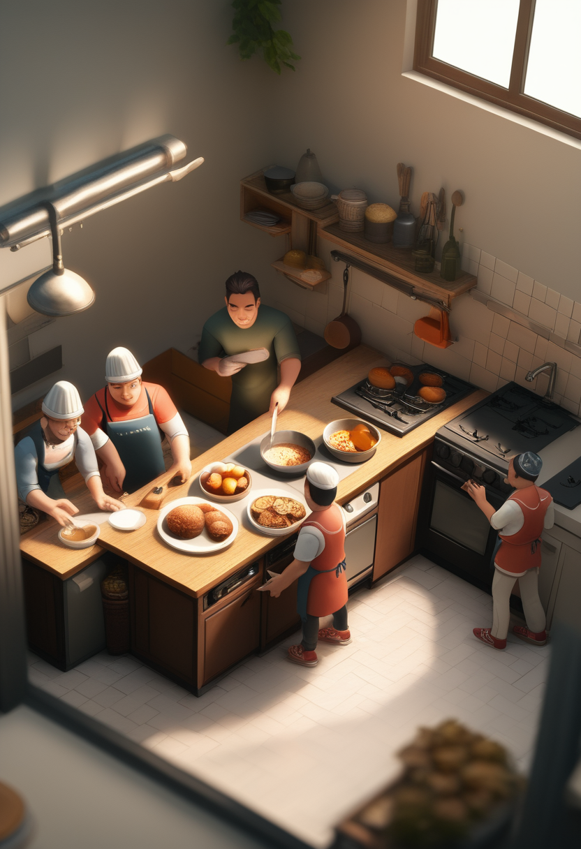 - isometric view, detailed anime mini +5boys, perfect anatomy, cook, uniform, cook hat, apron, cook uniform, clothed, cooking, baking, cleaning, detailed industrial kitchen decorations ,window, , from above, from isometric, 3d, absuredres, perfect quality, detailed background,, very aesthetic, absurdres, newest, perfect quality, original, amazing quality, masterpiece, very awa