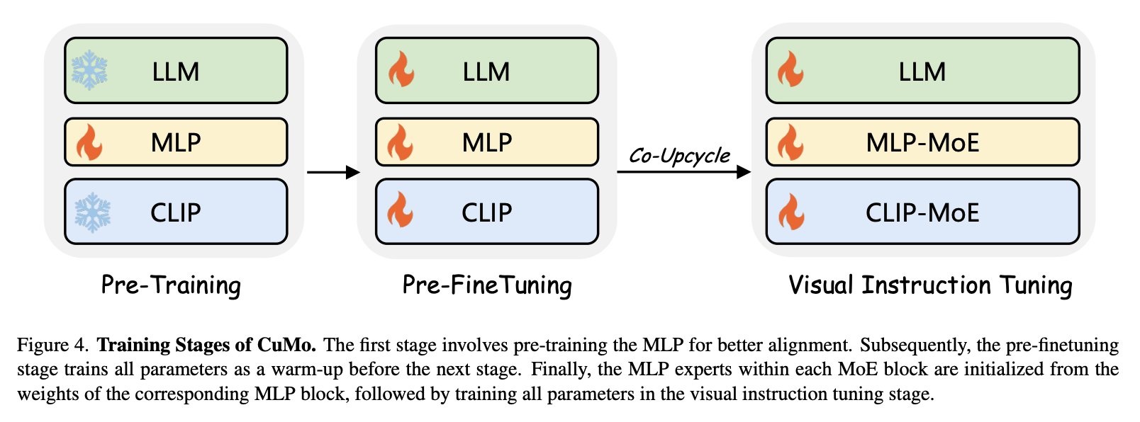 It's raining vision language models ☔️ CuMo is a new vision language model that has MoE in every step of the VLM (image encoder, MLP and text decoder) and uses Mistral-7B for the decoder part 🤓
