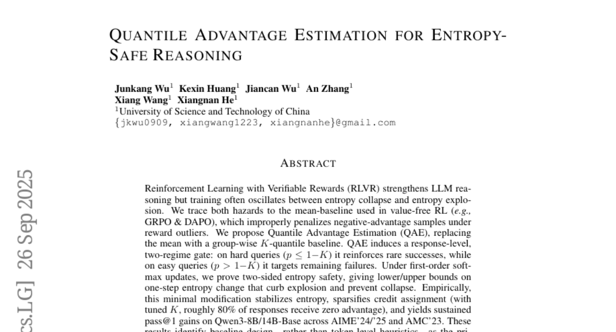 Quantile Advantage Estimation for Entropy-Safe Reasoning